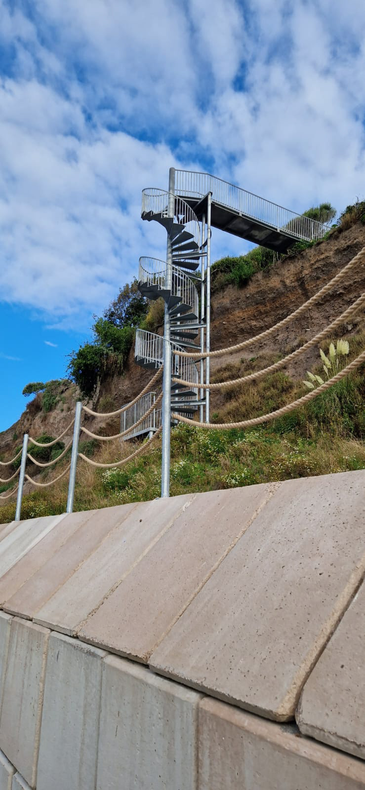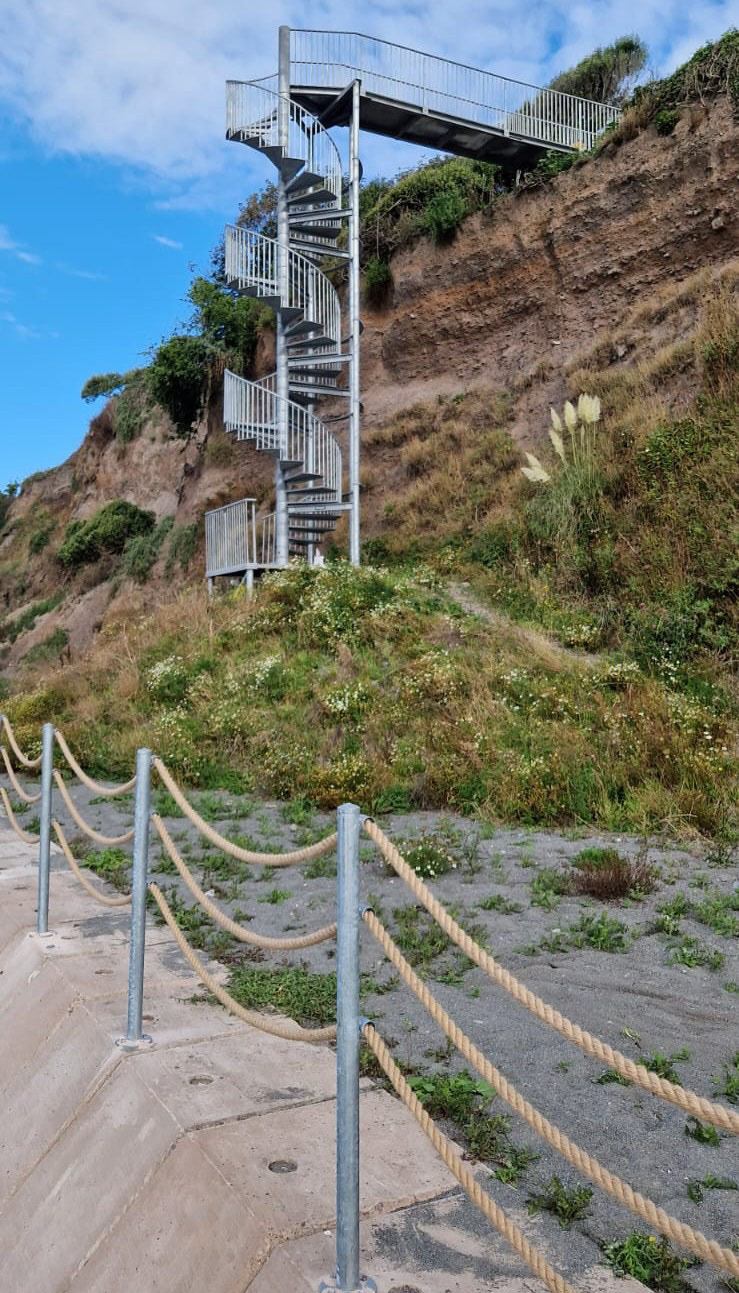• Main Spiral Staircase: Rising over 17 metres from the beach, constructed around dual internal columns encased by spiral risers. Each tread interlocked with balustrade segments to form a unified, load-bearing helix. The steel sub-frame was bolted to the 14m3 of reinforced concrete slab and backfilled with ballast to form a solid foundation for the main spiral and D-sections supports to be mounted to.
